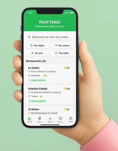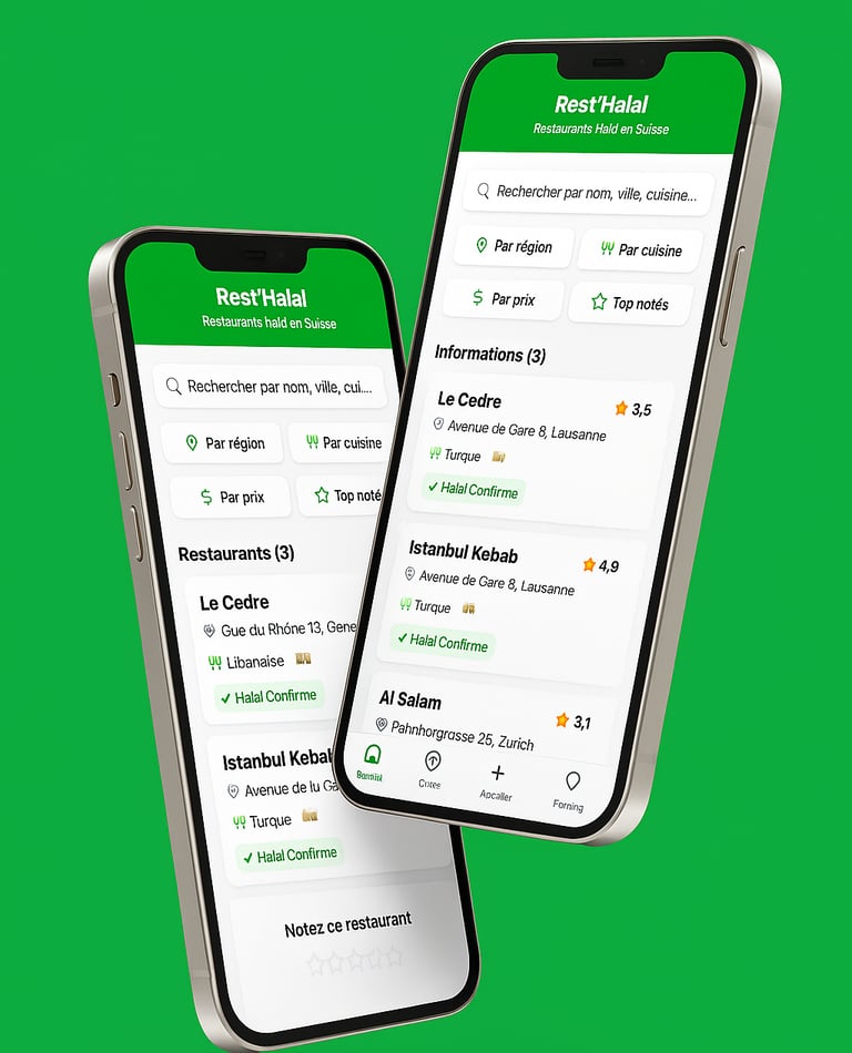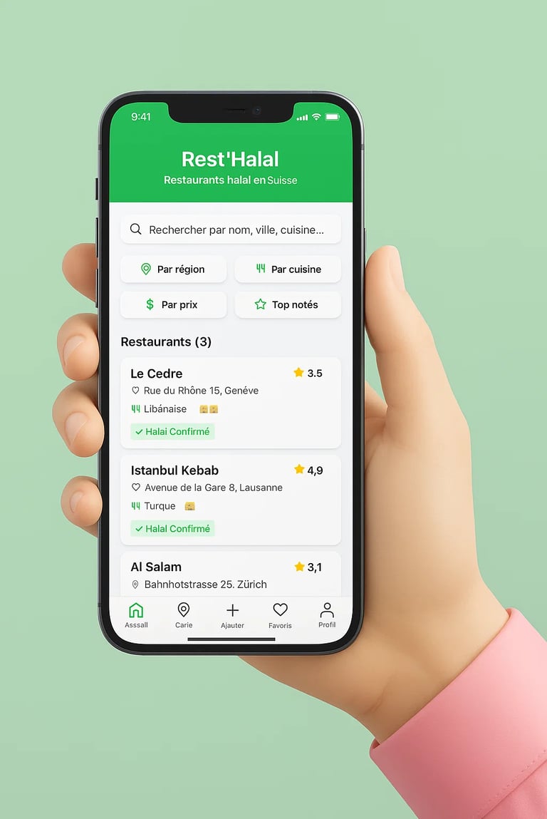 Chez Rest'Halal, notre mission est simple : t'offrir une plateforme claire et moderne pour que tu puisses trouver en un instant les restaurants halal autour de toi, en Suisse romande. Fini les doutes et les longues recherches – avec Rest'Halal, tu gagnes du temps et tu pars manger l'esprit tranquille.